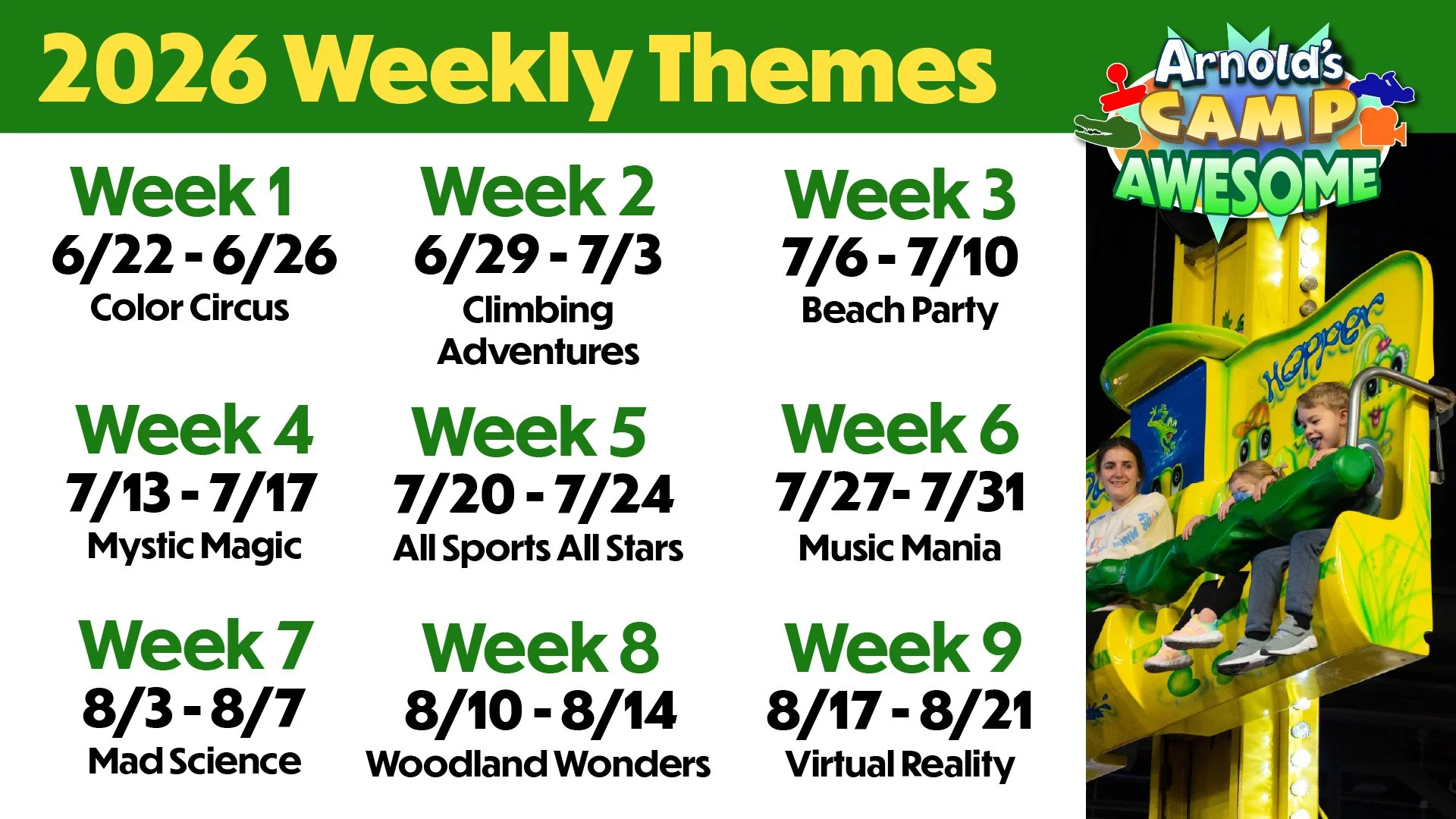 Arnold’s Camp Awesome runs M-F 8:30am-3:00pm. Arnold’s Camp Awesome 2026 will take place June 22-August 21.