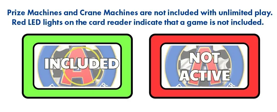 Please note that unlimited arcade play does not include crane prize machines or redemption tickets for prizes. You may purchase arcade points to operate prize machines if you wish to. Additional purchases can be made at the front counter.